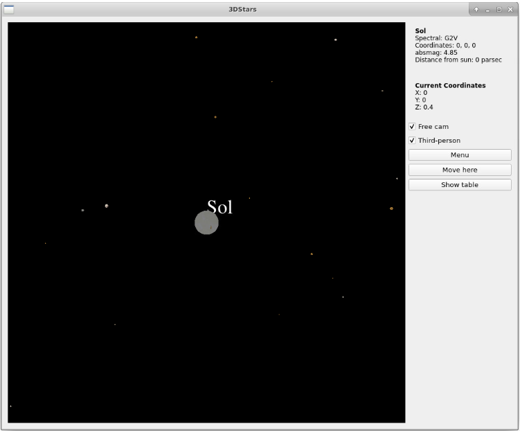 The project aims to develop a program that includes a three-dimensional atlas of space. The programme's universe consists only of stars located at a distance of 10 parsecs from the Sun and thus centred on it. As a user, one should be able to look out and travel around from one star to another but also be able to land on a star and thus observe space from a fixed point.